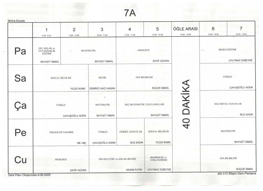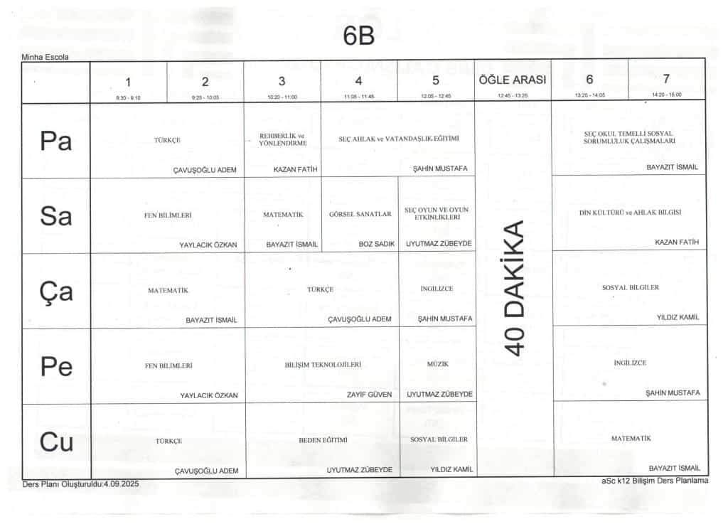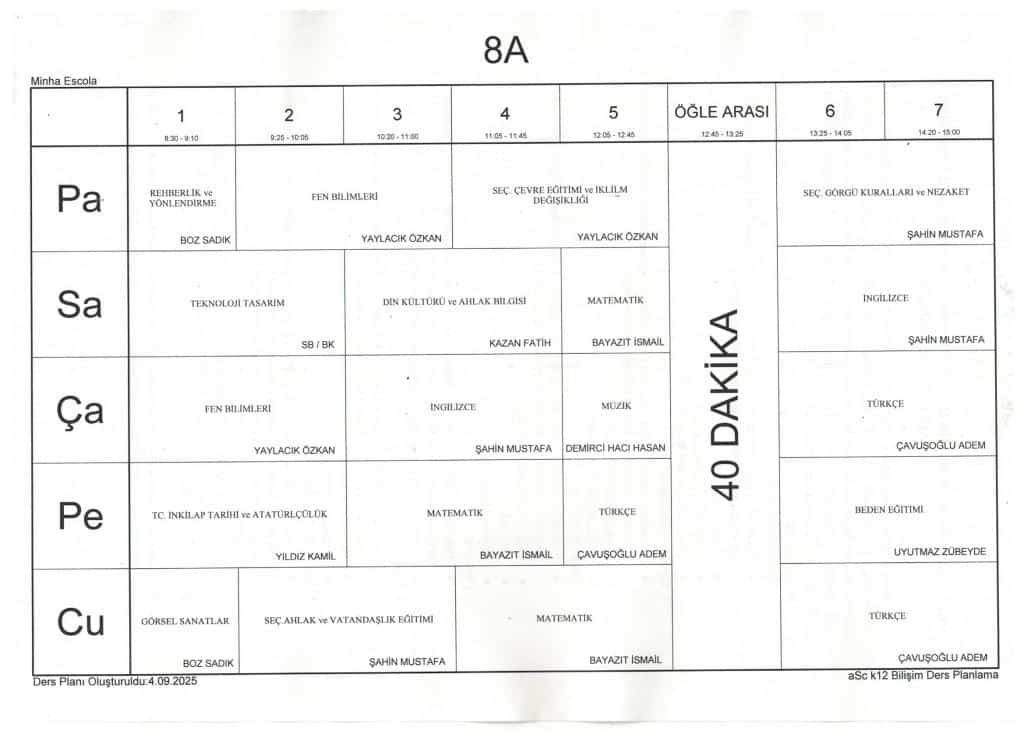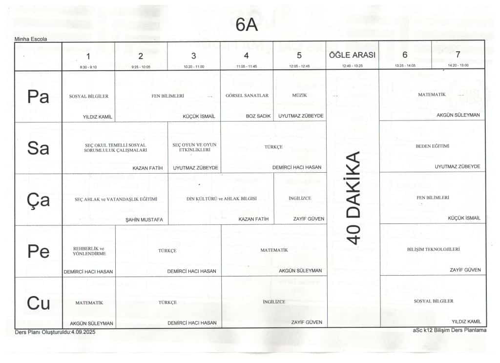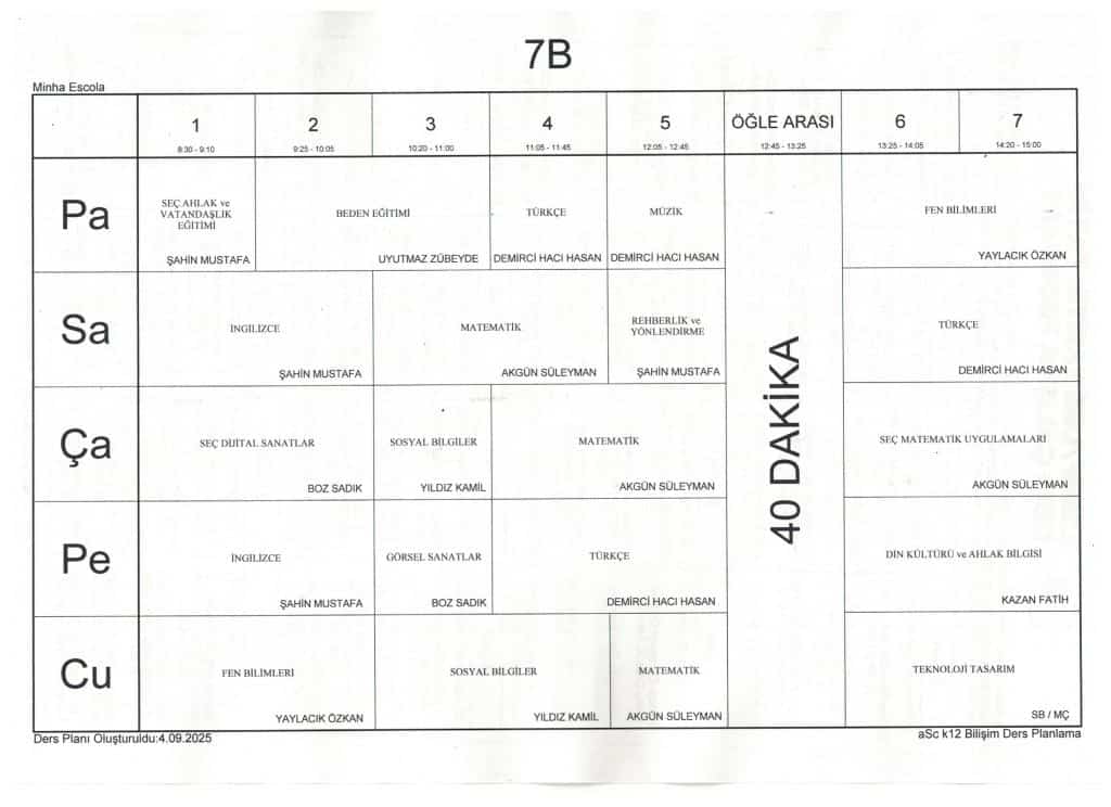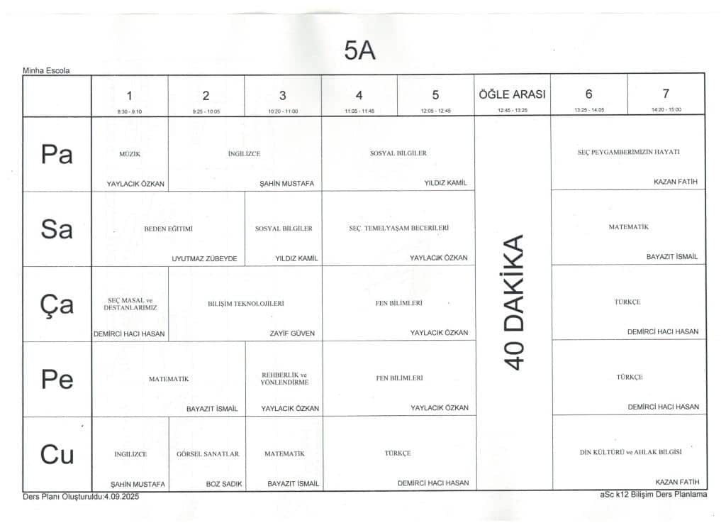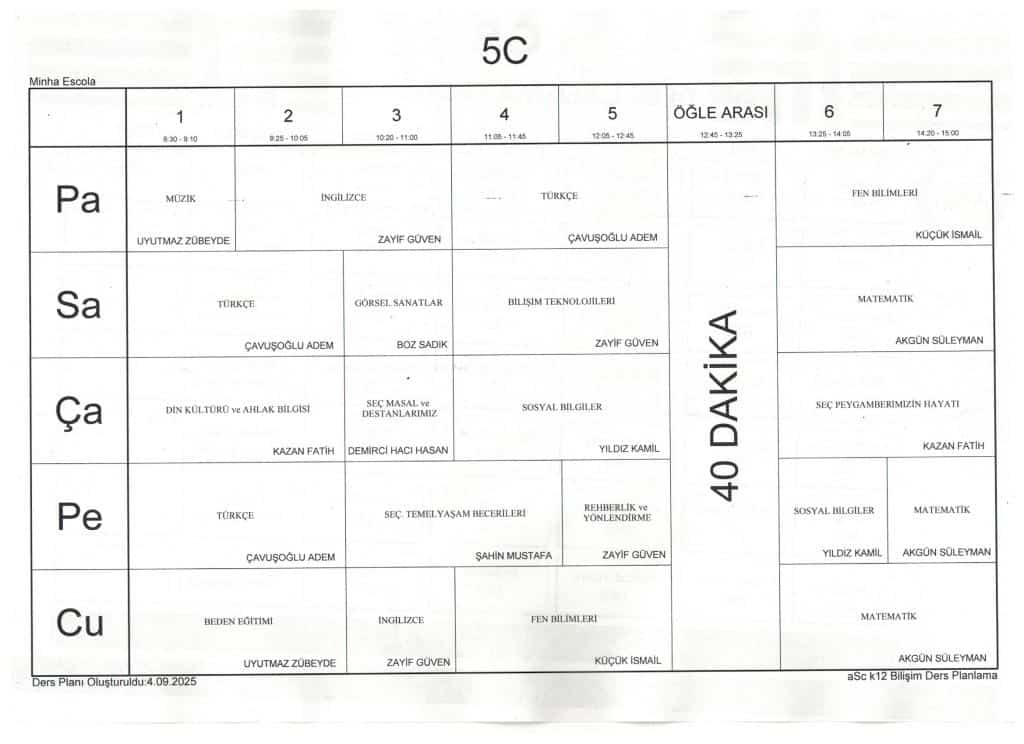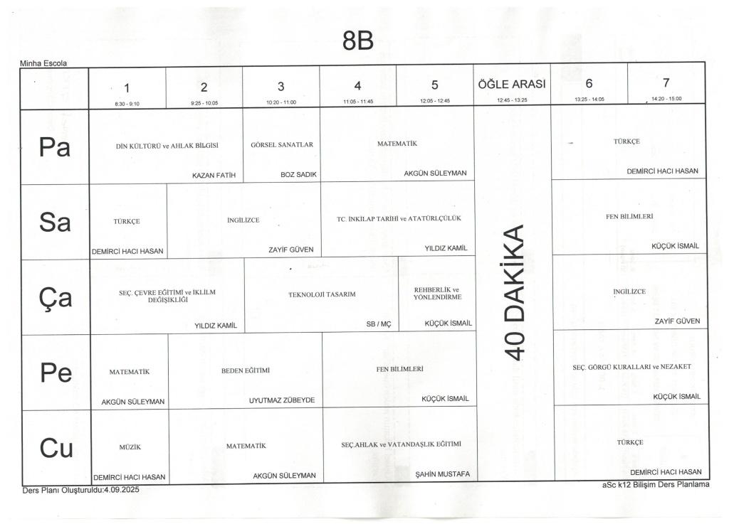 2025-2026 EĞİTİM-ÖĞRETİM YILI ÖĞRENCİ DERS PAROGRAMLARI (SINIFLARA GÖRE)